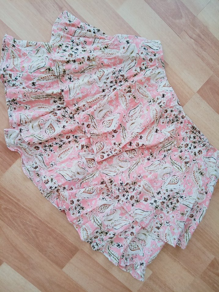 Yumuşak sentetik kumaştan yapılmış, pembe pastel desenli, bol kesim uzun fırfır detaylı, bohem stilde. az kullanılmış hiçbir kusuru yok içi şort şeklinde pileli şifon etek yazlık cıvıl cıvıl renklerde bel ölçüsü 37 santim boy uzunluğu 38 santim