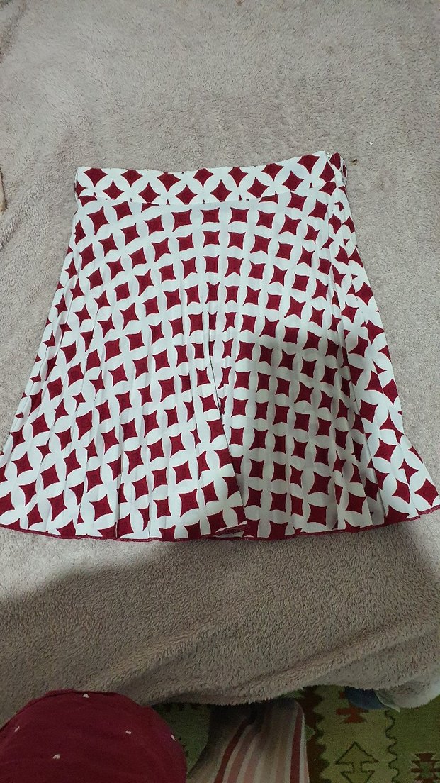 Yumuşak sentetik kumaştan kırmızı pilili midi etek, renkli geometrik desenli, konvansiyonel ve dar kesim, günlük kullanım için uygundur.