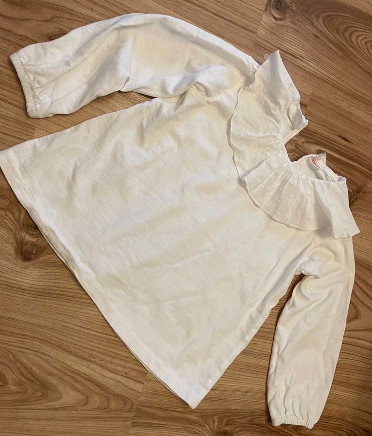 Kız çocukları için uzun kollu, bol kesim pamuklu kumaştan yapılmış beyaz fırfırlı bluz. Fırfırlı yaka ve bohem tarzda sade tasarım. Son fotoğrafta gösterdiğim dikilerek çözümecek defosu var. fiyatını uygun koydum.