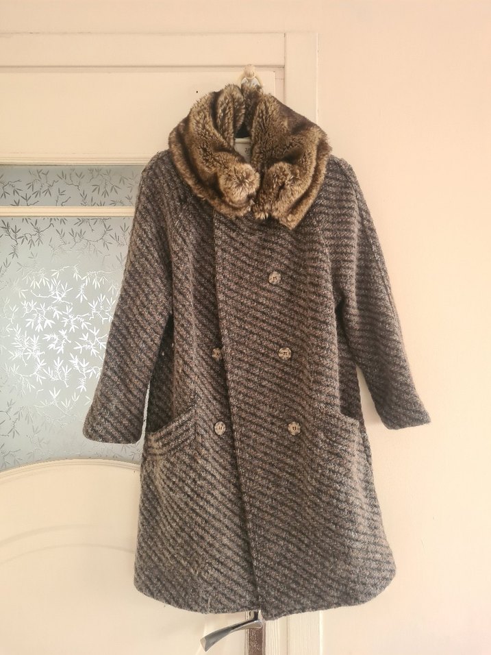 Desenli kumaştan çift düğmeli kaban, yumuşak kürk yakalı ve iki ön ceplidir. Sıcak ve dokulu yapıya sahiptir.