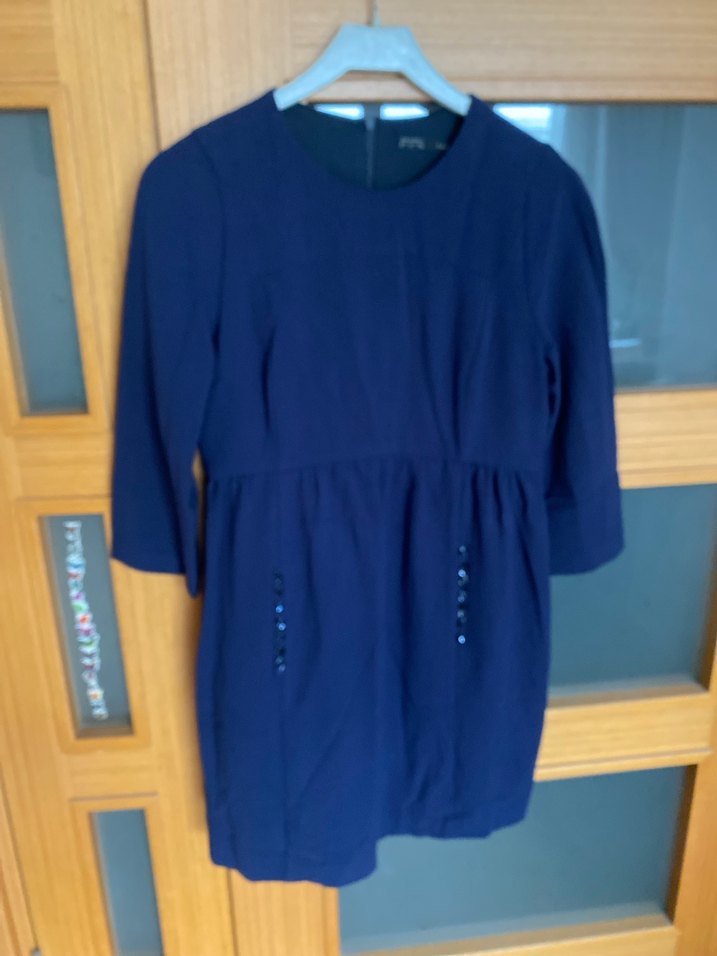 Zara Marc’a ve uzun kollu lacivert elbise . Midi boy, bol kesim ve sentetik kumaştan üretilmiştir. Cepleri ve cepleri üstünde şık bir işlemesi var Günlük iş stiline uygundur.