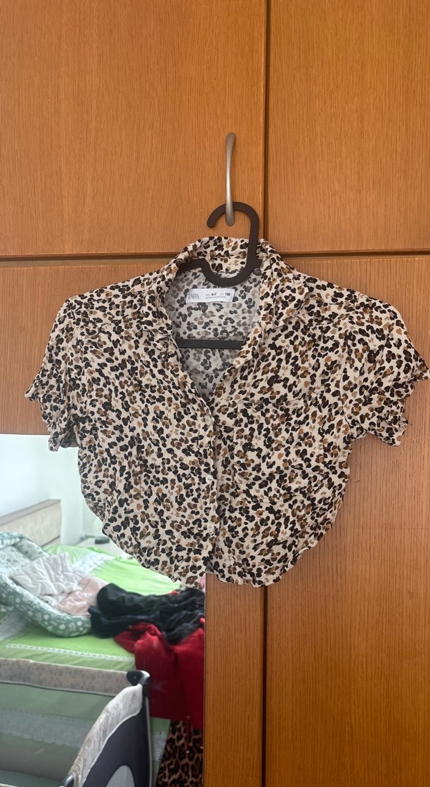 Zara marka kız çocuk leopar crop gömlek. Koyu kahverengi leopar desenli.