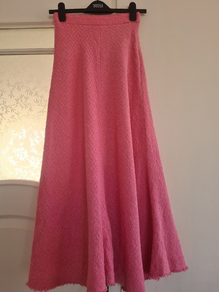 Pembe renkte, drapeli tasarıma sahip uzun ve bol kesim kadın eteği. Yumuşak sentetik kumaştan üretilmiştir ve ofis kullanımı için uygundur.