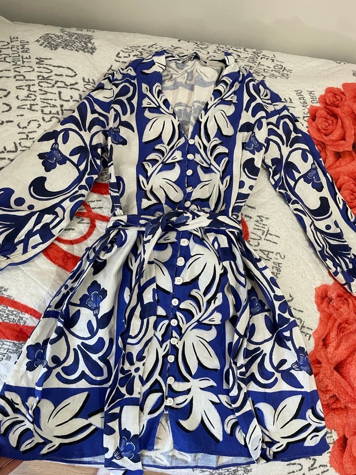 Uzun, bol kesim bohem elbise, renkli mavi-beyaz çiçek desenli, uzun kollu ve düğmeli. Belde ayarlanabilir kemer bulunur. Xs-S bedenlere göre Zara Marka