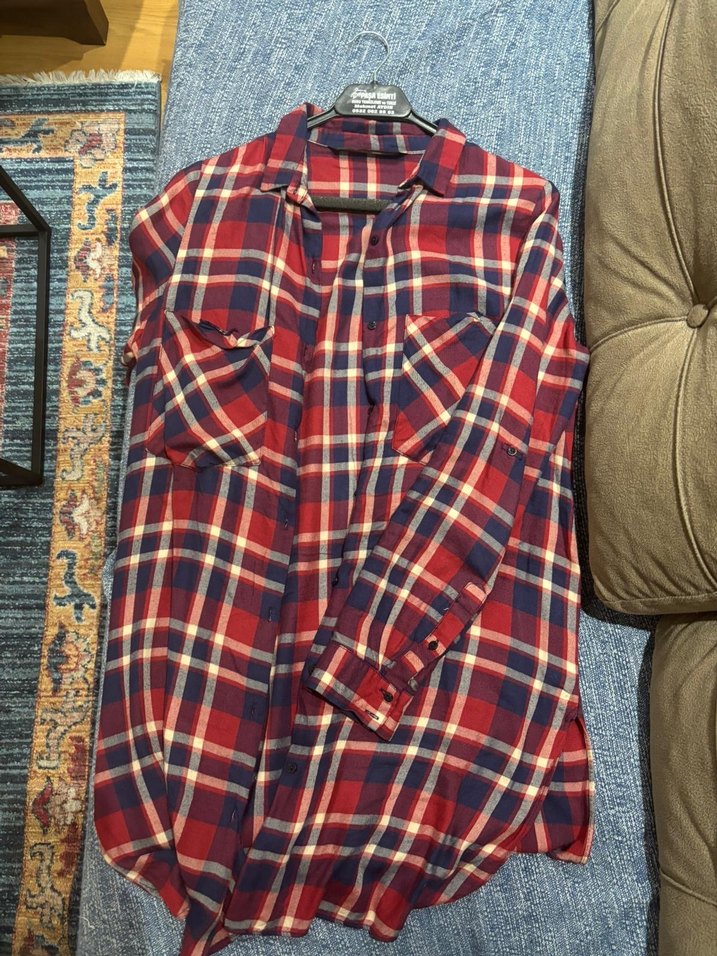 Uzun kollu, yakalı, kırmızı ekose desenli, rahat kesim kadın gömleği, günlük kullanıma uygun.