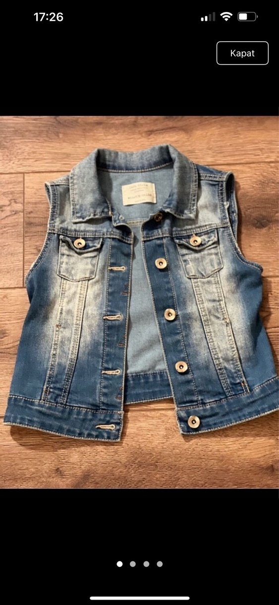 Düğmeli, kolsuz, mavi denim yelek. Fitted kesim, notched lapel yaka ve parlak görünüme sahip, günlük ve sokak stiline uygun.