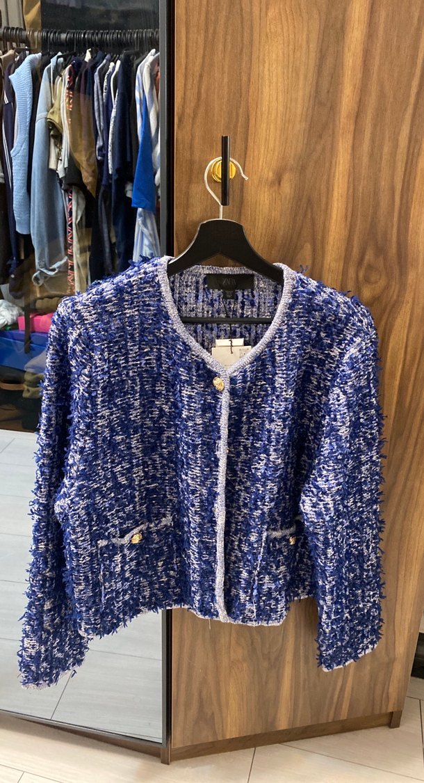 Mavi bağlama desenli örgü kadın ceket, uzun kollu ve notlu yaka detaylıdır. Gevşek kesimi ve midi boyu ile günlük kullanıma uygundur. ✨ Hiç kullanılmadı, etiketli duruyor.