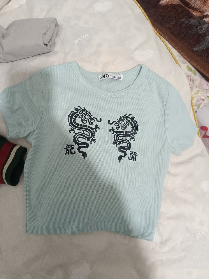 Zara Mavi Baskılı Kısa Kollu Crop Tişört
