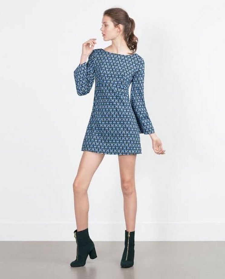 ZARA Mavi Batik Desenli Uzun Kollu Kısa Elbise