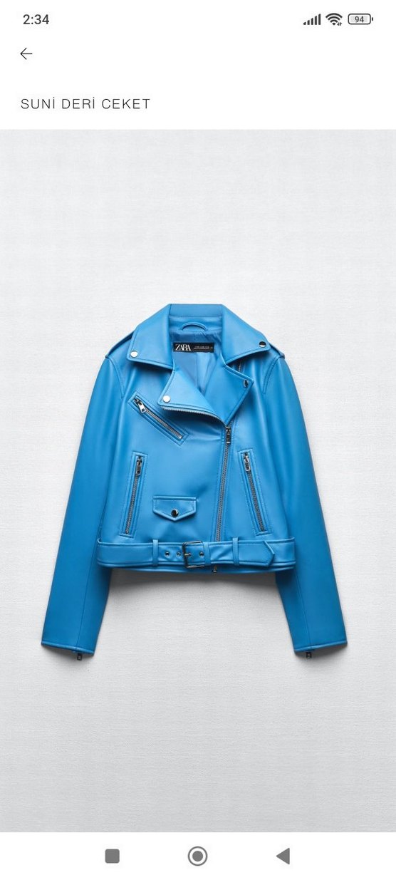 Kemerli, parlak mavi biker deri ceket. Notlu yaka ve fermuarlı ceplere sahip, şık ve fit kesim. 1 kere giyildi sadece