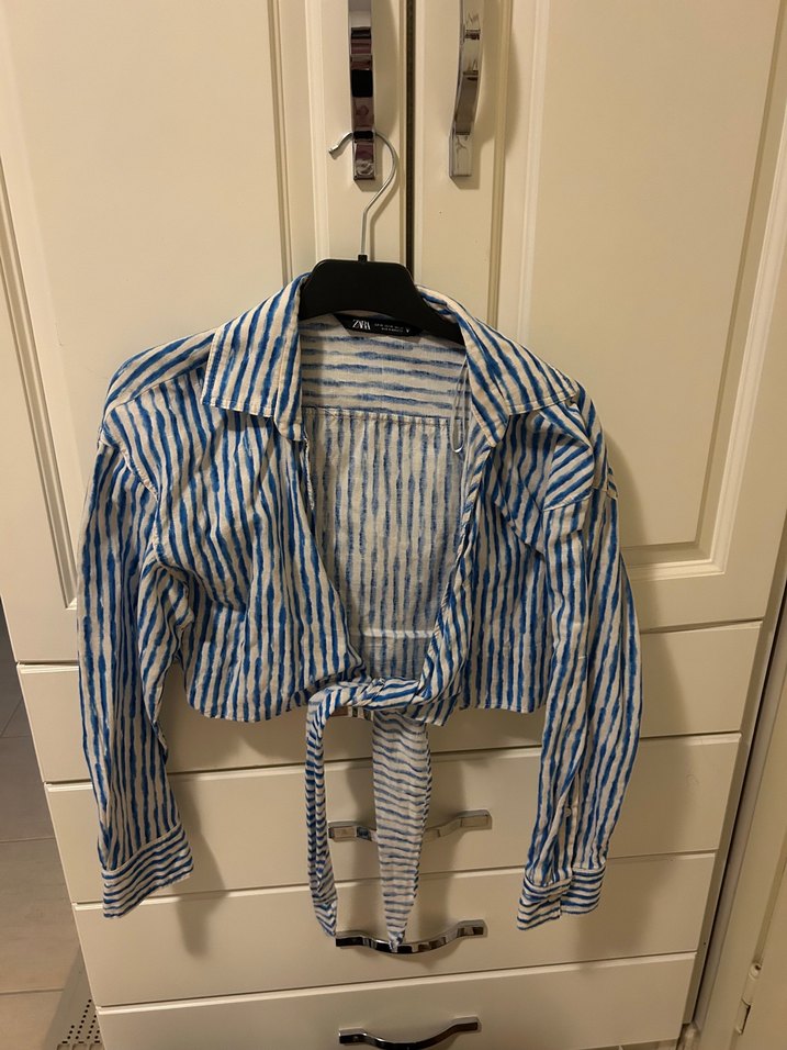 Zara Mavi Çizgili Kısa Keten Gömlek
