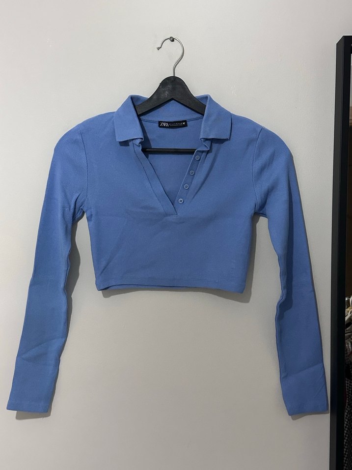 ZARA Mavi Crop Top Kadın Uzun Kollu Polo Yaka