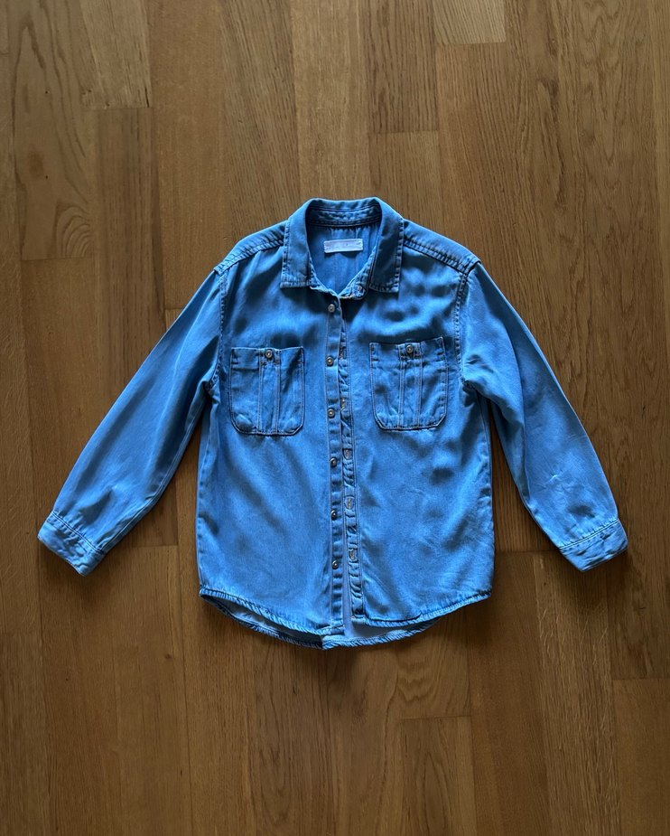 Zara mavi denim uzun kollu gömlek. Önden düğmeli kapama. Göğüste yama cep. 61% liyosel, 39% pamuk 9 Yaş - 134 cm