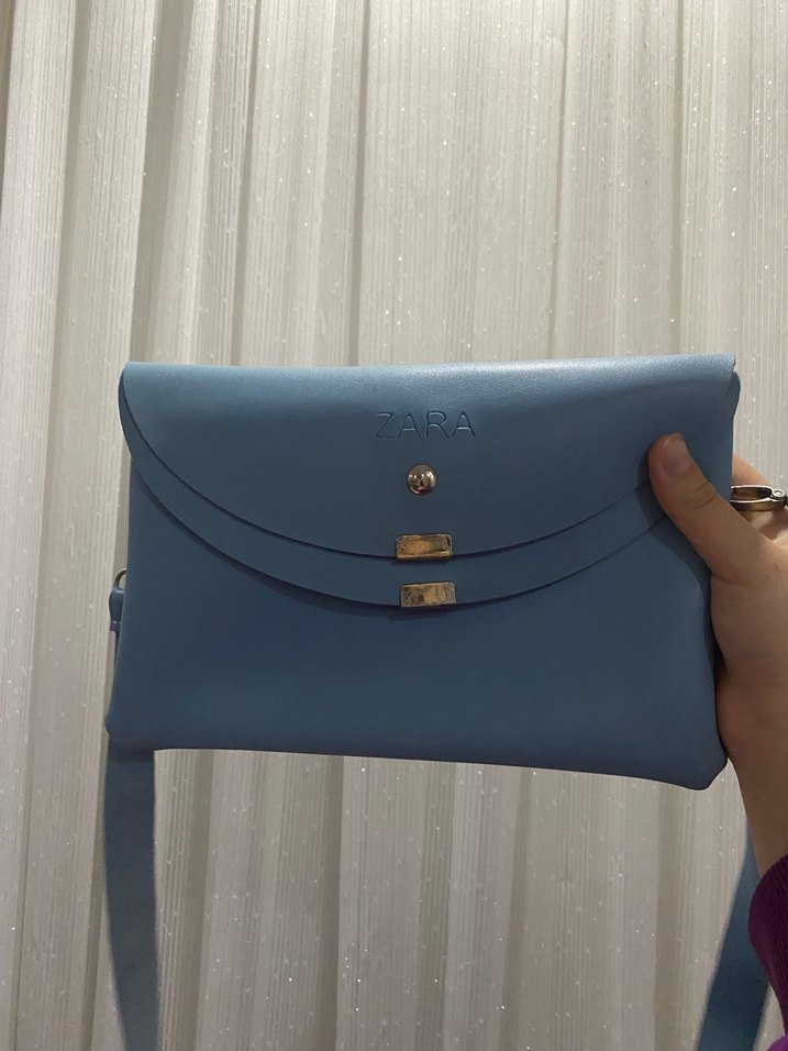 Zara marka, pastel mavi deri kadın çanta, tokalı kapak detaylı, minimalist ve bohem tarzı bir arada sunar.