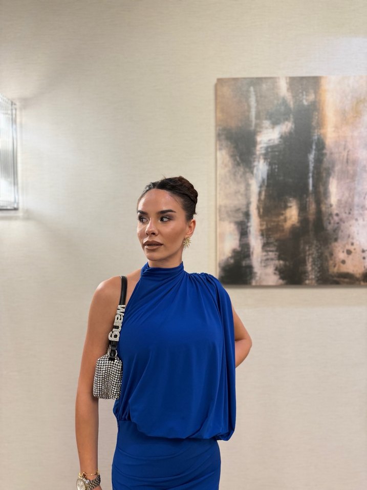 Parlak mavi, askısız mini abiye elbise, drapeli ve bol kesim tasarımıyla cesur sokak stili için uygundur. ✨