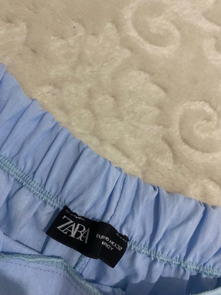 ZARA markalı, keten kumaştan yapılmış, bol kesim ve fırfırlı detaylı pastel mavi mini hamile eteği. Günlük kullanıma uygundur.