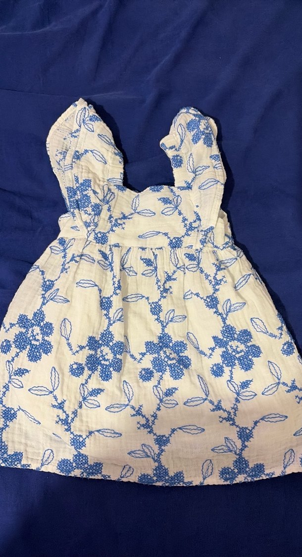 Kolsuz, straplez kız elbisesi mavi çiçek işlemeleri ve fırfır detaylarına sahiptir. Gevşek kesim ve pastel ton bohem tarzı için uygundur. Gayet iyi durumdadır