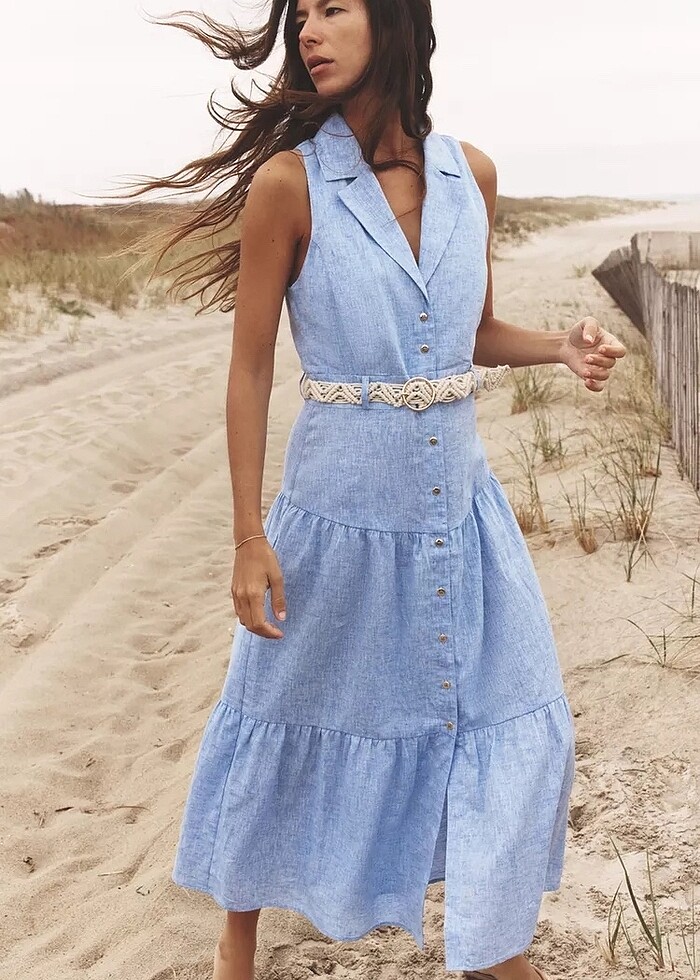 Yeni etiketli Zara kemerli keten elbise. Yaka ve kolsuz elbise. Örme kemer detaylı. Önden düğmeli. #zara#kemerli#keten#elbise#mavi