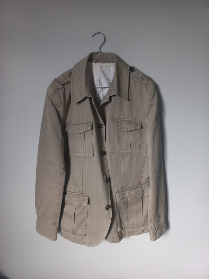 Bej keten kumaştan, yakalı ve düğmeli erkek ceket. Uzun kollu, regular fit ve günlük sokak tarzına uygun. Yakasında iç kısımda hafif sararma lekeler var.