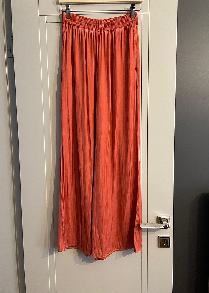 Yazlık rahat kalıp kumaş pantolon. Saten gibi aşırı parlak değil, pamuklu bir kumaş, hafif yansıması var. Herhangi bir kusuru yoktur. Sadece dolapta biraz kırıştı. S beden olmasına rağmen uzun ve bol geldiği için satıyorum. Aynı ürünün S ve M beden olarak siyah rengi de mevcuttur, dileyene siyah rengi gönderebilirim. Onlar da 1-2 kez giyildi, kusurları yok.