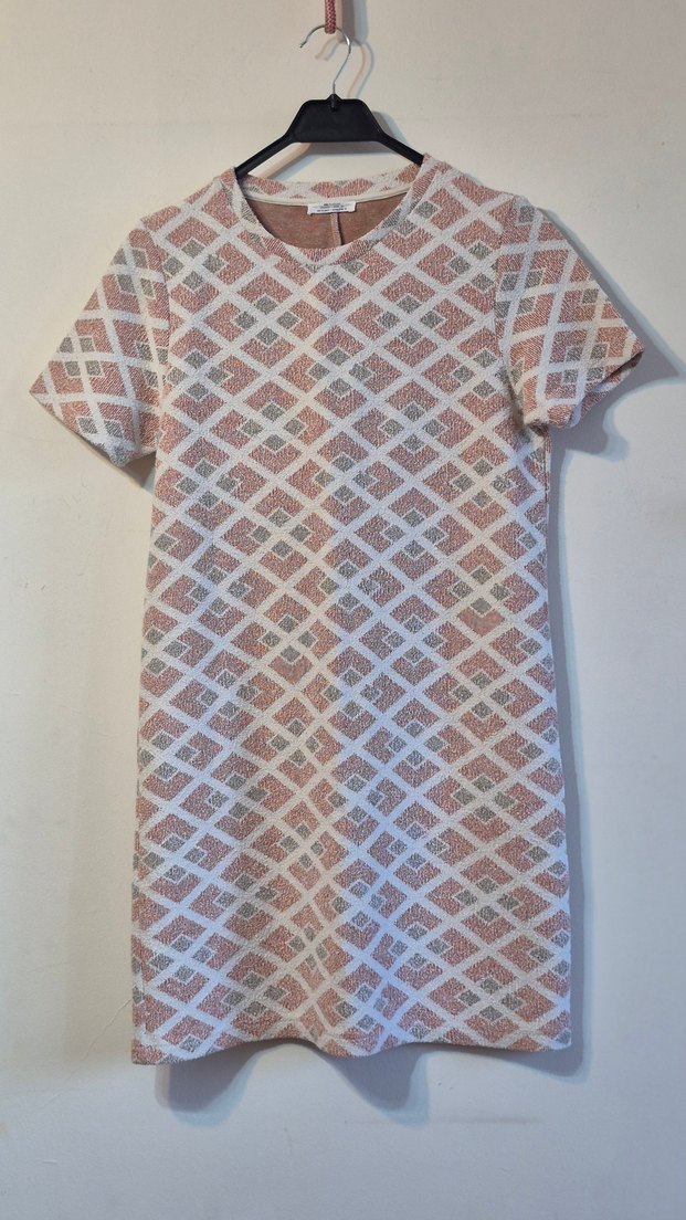 Bej renkte, kısa kollu ve crew yaka midi boyda, desenli ve örme dokulu bohem tarzda rahat kesim elbise.