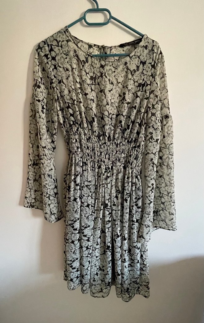 Gri çiçek desenli, uzun kollu, şifon, bol kesim midi elbise. Yumuşak sentetik kumaştan, günlük kullanım için uygundur. Sayılı kullanıldı.