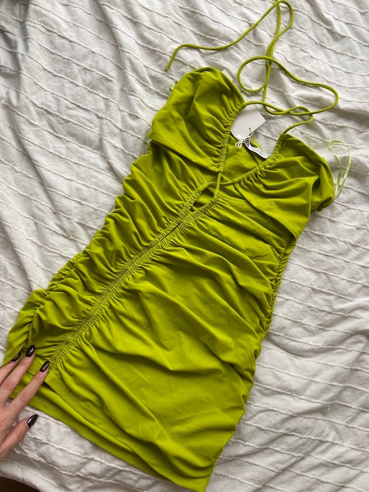 Yeşil renkte, drapeli mini elbise. İnce askılı, vücuda oturan kesimiyle parti için uygun.