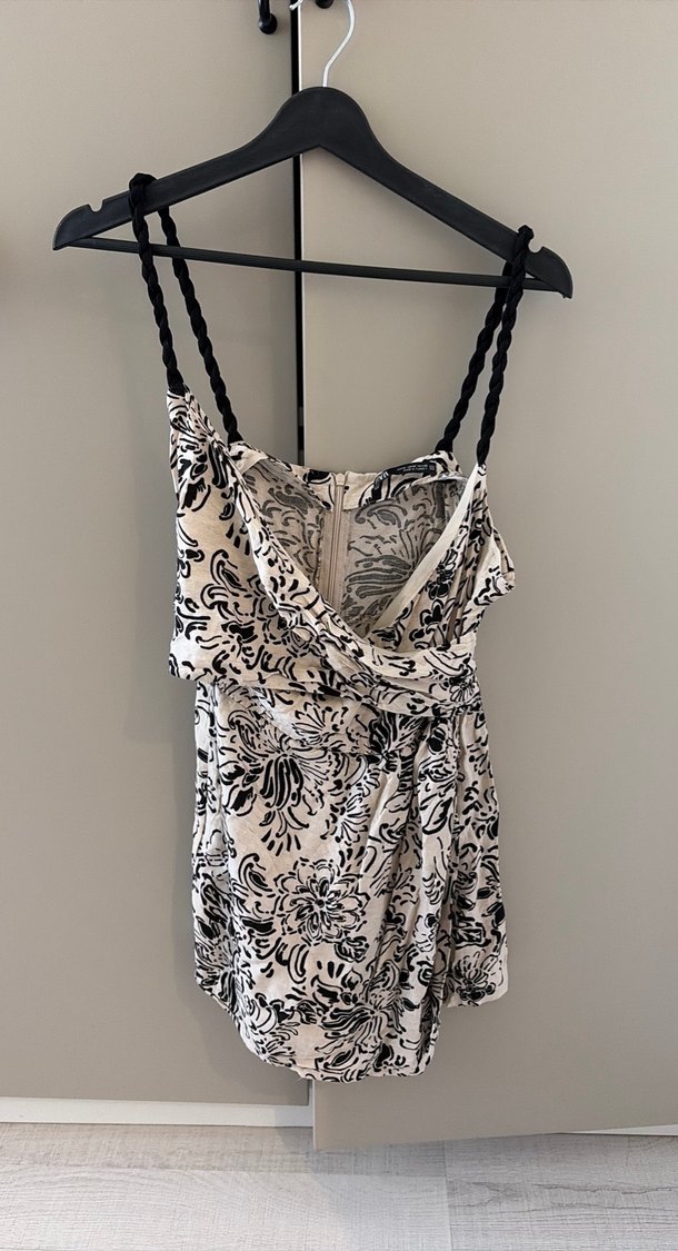 Bu dar kesim mini tulum, askılı ve drapeli ön detaylı, straplez yakaya sahiptir. Gri ve beyaz baskılı kumaştan, romantik akşamlar için uygundur.