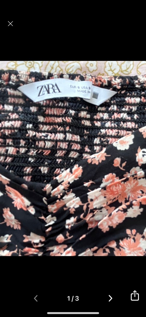 Zara markalı, koyu pembe çiçek desenli, V yakalı, fırfırlı ve bol kesim mini bluz. Kısa kollu, bohem tarzda günlük kullanım için uygun.