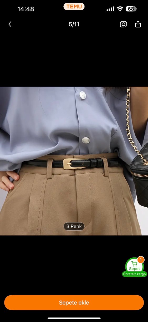 İthaldir. Bej deri kadın kemeri, siyah tokasıyla Paris sokak modasına uygun şık ve rahat bir görünüm sunar.