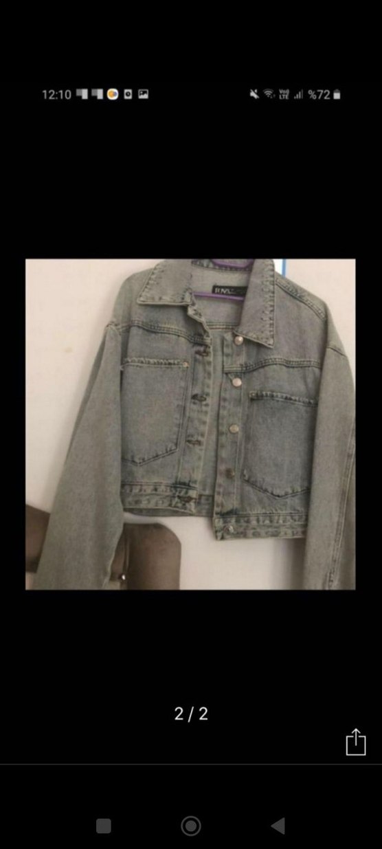 Gri denim kumaştan, düğmeli, yakası kesik ve uzun kollu, bol kesim kadın ceket. Günlük rahat ve sokak stiline uygun.