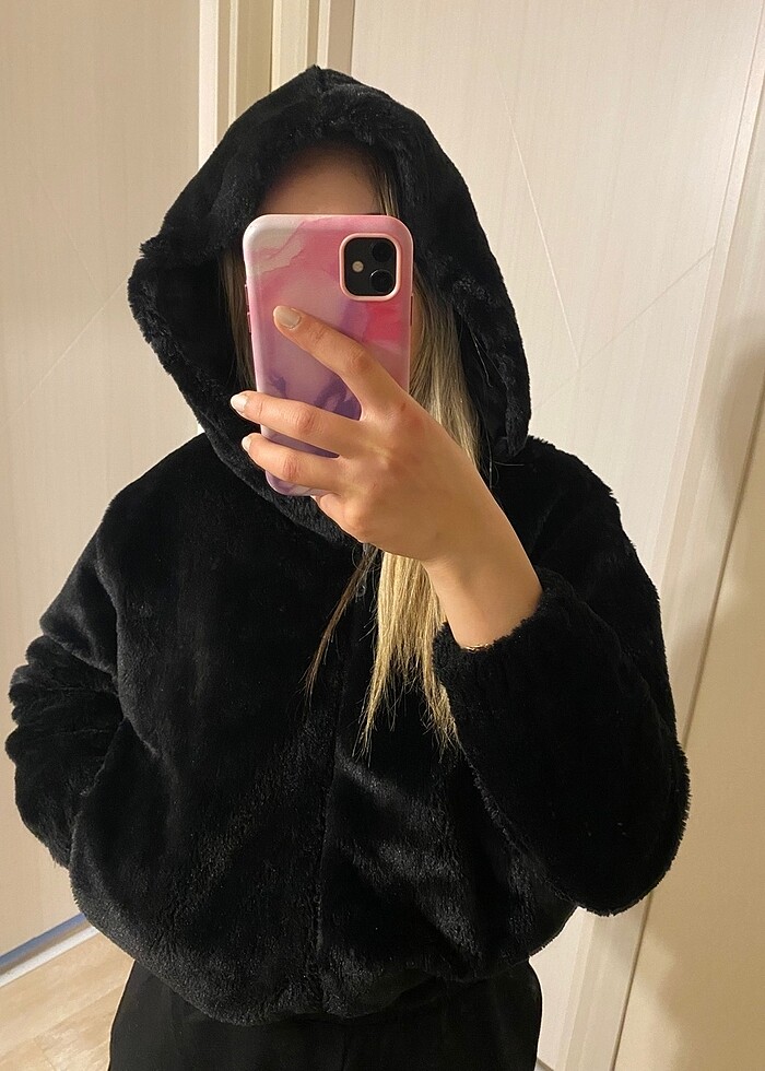 Pelüş mont kapşonlu fermuarlı çepli siyah S beden bir kaç defa kullandım