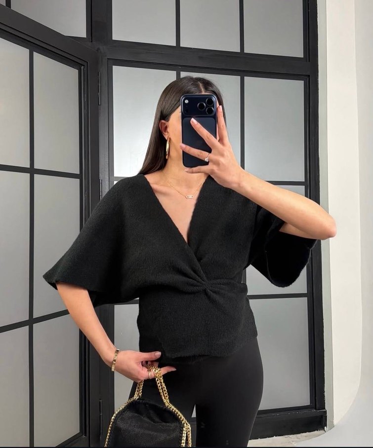 Siyah renkli, kruvaze kesimli triko bluz. •Ürün standart bedendir. •Ürün sıfır etiketlidir