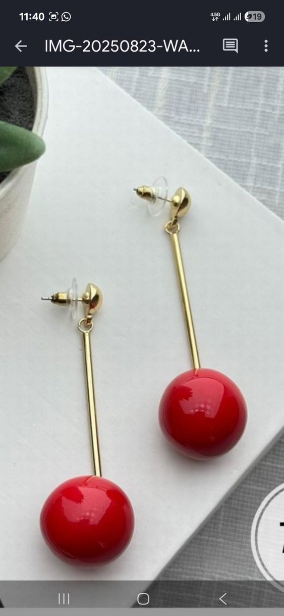 Zara model Uzun, ince altın renkli sap üzerinde cesur kırmızı boncuklu toplar bulunan minimalist ve çağdaş tarzda küpe. ❤️