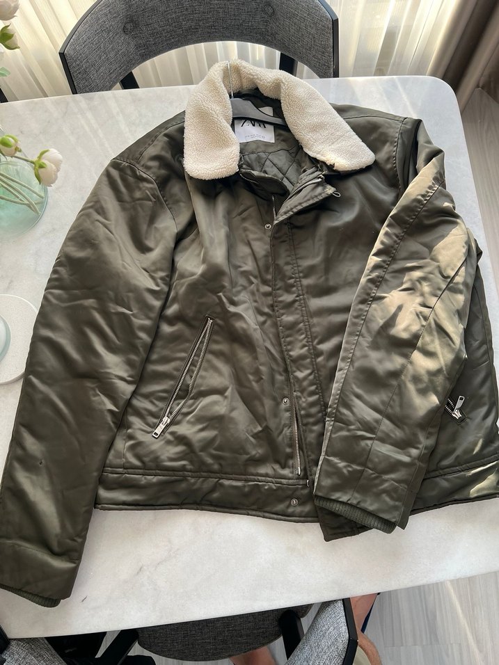 Küçük bi sıgara yanık izi var onun dışında bir problem yok .Haki renkte, regular fit kesime sahip Fermuarlı cepler, uzun kollu ve yaka kısmı fleece kumaşla kaplıdır. Günlük kullanıma uygundur.