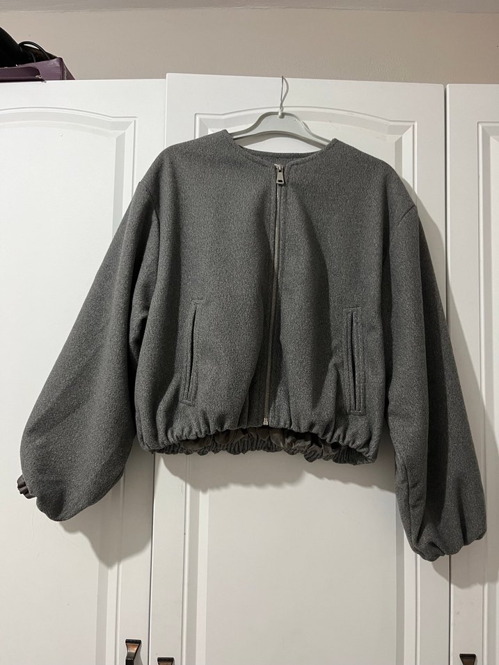 Gri renkte, fermuarlı, uzun kollu ve bol kesim kadın zara muadil ceket. Yumuşak kumaştan, yuvarlak yakalı ve elastik bel detaylıdır. Rahat günlük kullanım için uygundur.