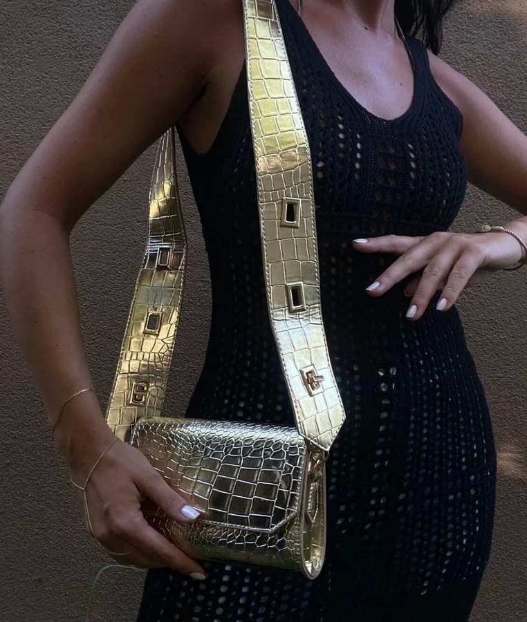 Parlak altın renkli, yılan derisi desenli deri kadın çantası, kalın kemer askısı,tertemizdir sorunsuz. Marka Temsilidir