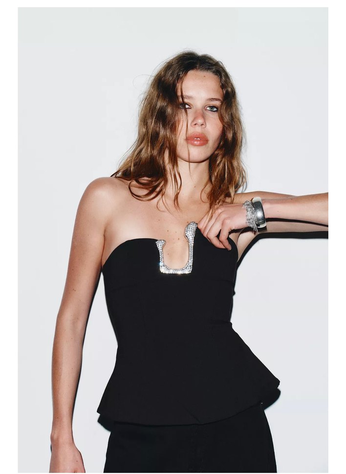 Sırttan fermuar detaylı, önü taşlı mücevherli siyah omuzları açık çok şık viral olan bustiyer üst top bluz