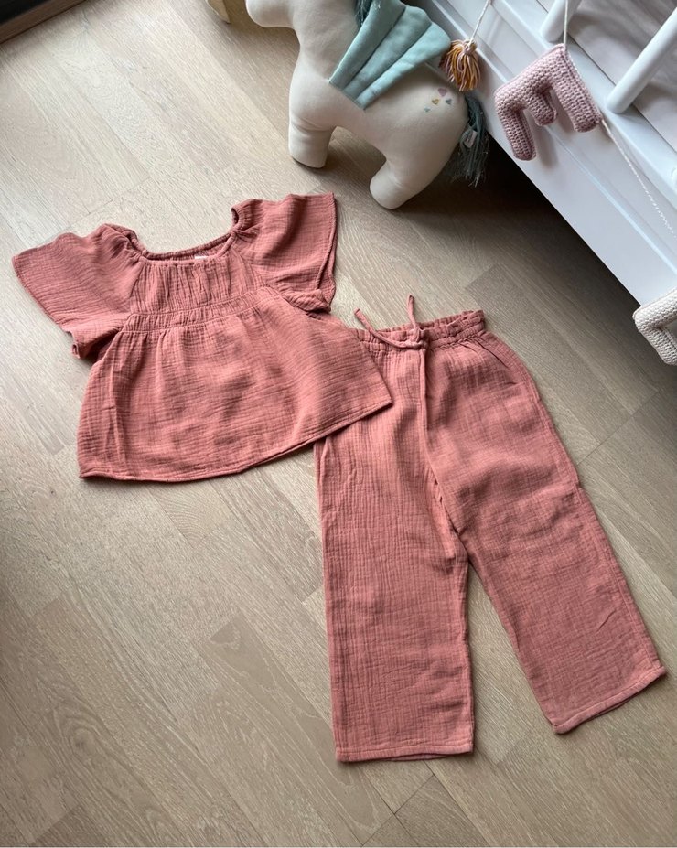Zara takım, 104 beden (3-4 yaş). Müslin ince kumaş-baharlık, yazlık takımı. Sadece bir kere giyildi ve bir kere yıkandı. Tertemiz.
