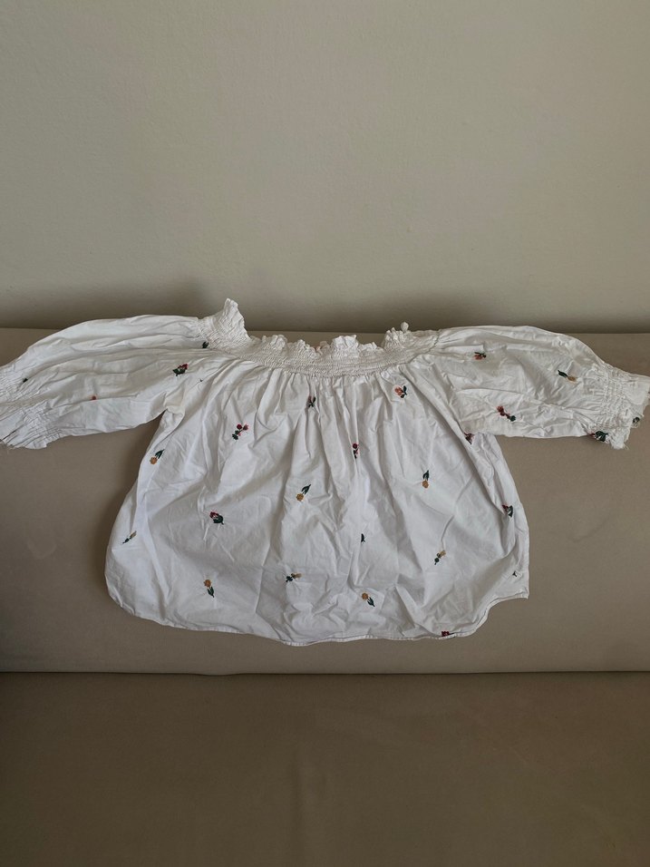 Nakışlı desenlere sahip beyaz pamuk bluz, straplez, carmen yaka ve fırfır detaylıdır. Kısa kollu, bol kesim ve midi boyda, vintage bohem tarzda.