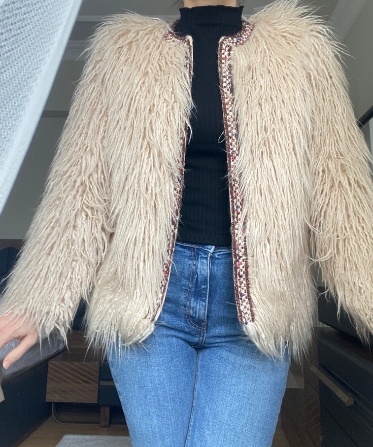 Zara Nakışlı Bej Kadın Yünlü Midi Peluş Ceket