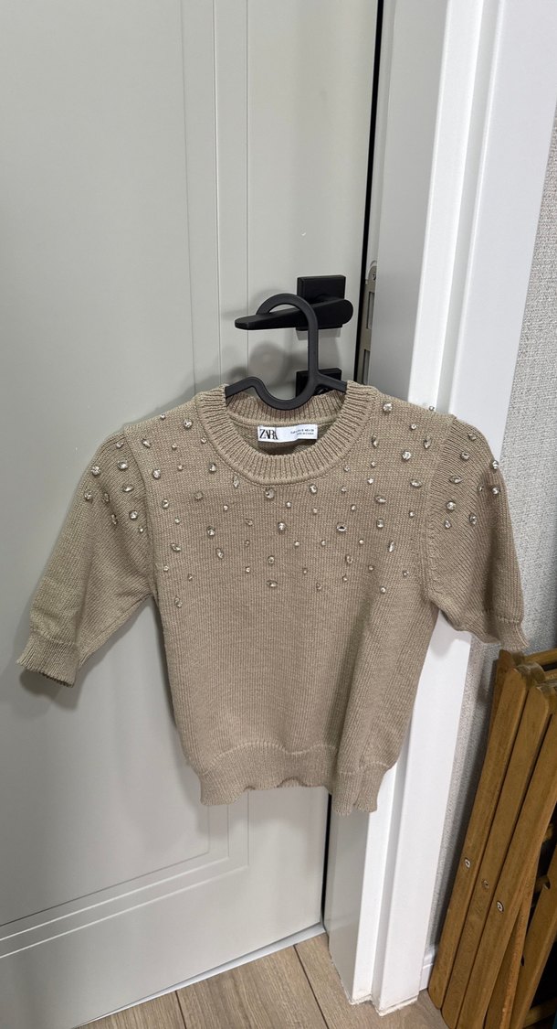 ZARA Nakışlı Bej Kısa Kollu Triko Kazak