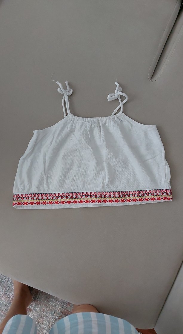 Gevşek kesim, beyaz kız bluzu. Kayık yaka ve kolsuz tasarım, etek kısmında nakış ve fırfır detaylı, bohem tarz için uygun.