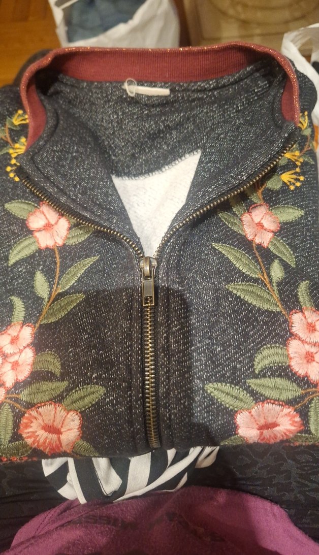 Renkli nakışlı çiçek desenlerine sahip koyu renkli genç.kız ceketi. Notlu yaka, uzun kollu ve fermuarlı. ZARA midi boy, bohem tarzı sunar.