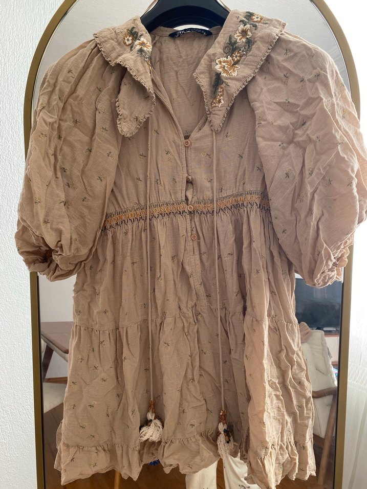 Zara Nakışlı Bohem Hamile Krem elbise