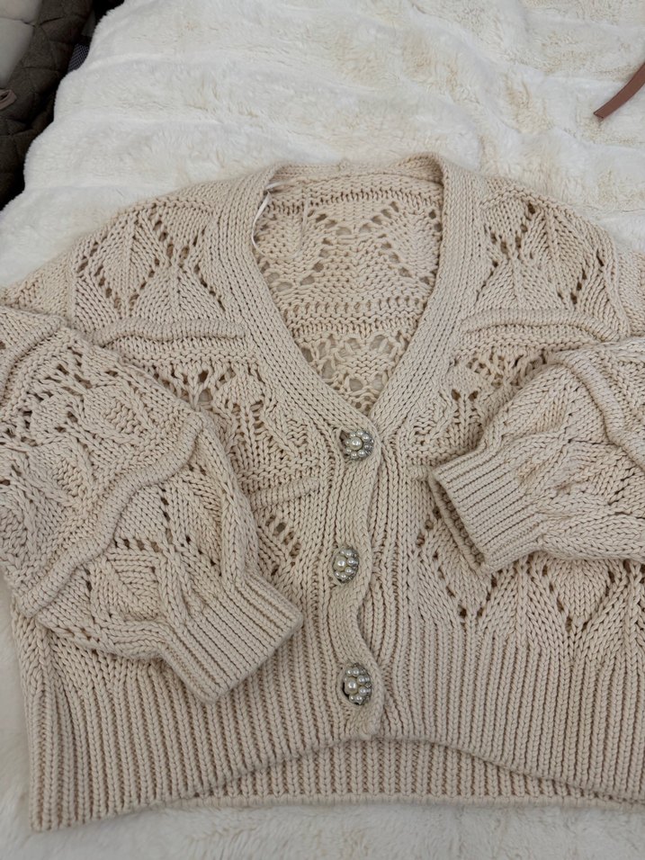 Bej renkli, nakışlı örgü hırka, bol kesim, uzun kollu ve kısa boydadır. Yuvarlak yaka ve süs düğmeler içerir, bohem tarzına uygundur.