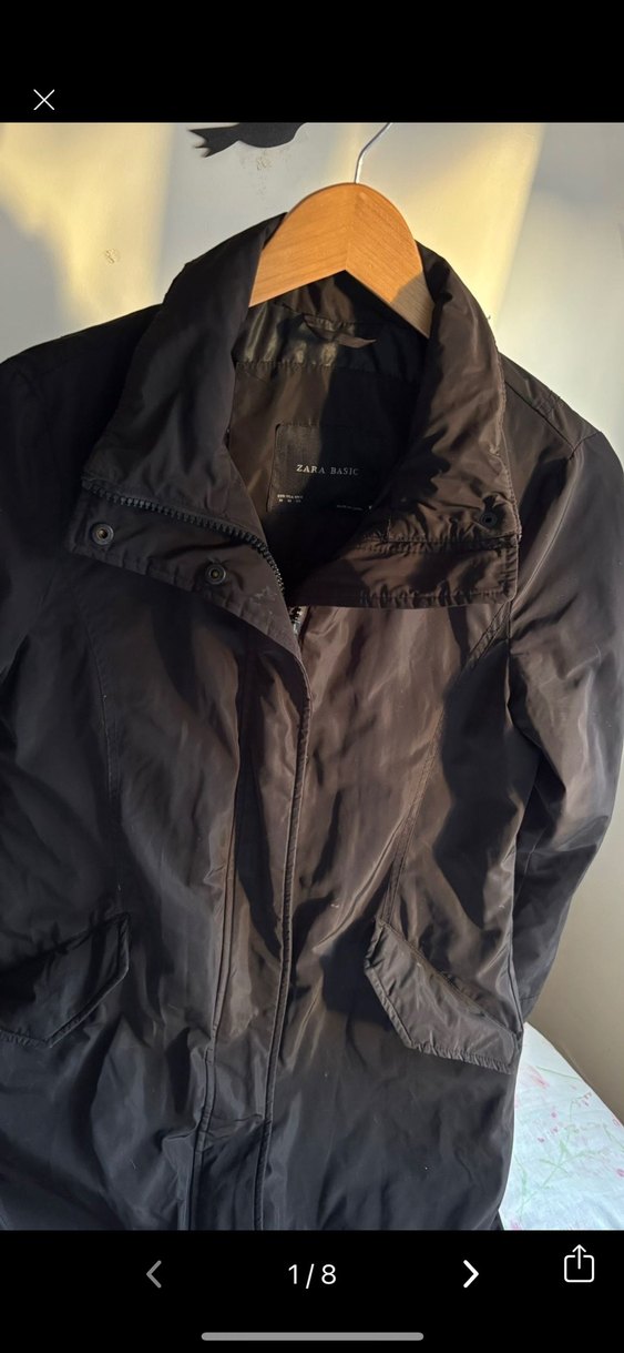 Orijinal kodu mevcut fotoğraflarda 1-2 kere giyilmiş Siyah, yakalı ve fermuarlı kadın ceketi. Uzun kollu, midi boy ve ince kesim, satenimsi dokuda, sokak stiline uygun.