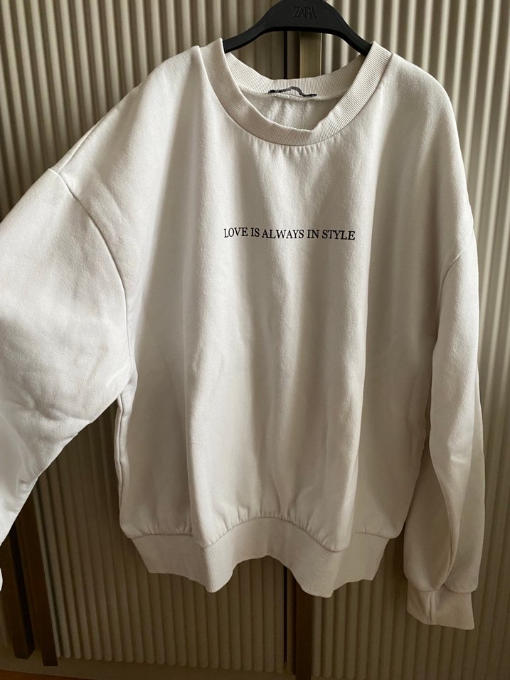 Beyaz, bisiklet yaka, uzun kollu ve bol kesim sweatshirt. Önünde "LOVE IS ALWAYS IN STYLE" yazılı baskı bulunur. Rahat ve günlük kullanıma uygun. Bir iki giyilmiştir