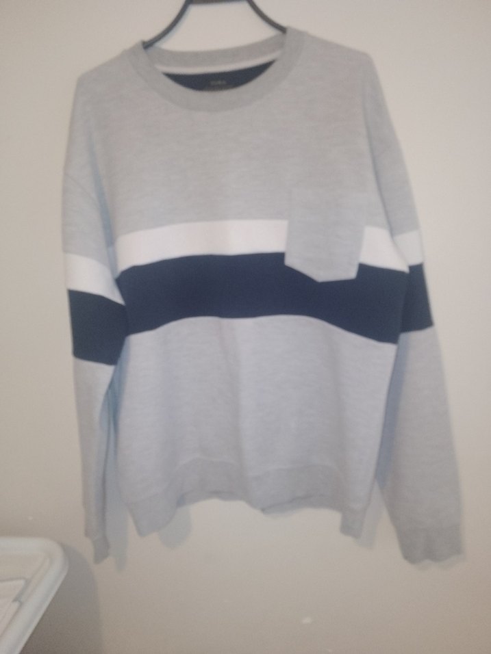 Gri, beyaz ve lacivert çizgili, yumuşak ve sıcak dokulu, uzun kollu, bisiklet yaka