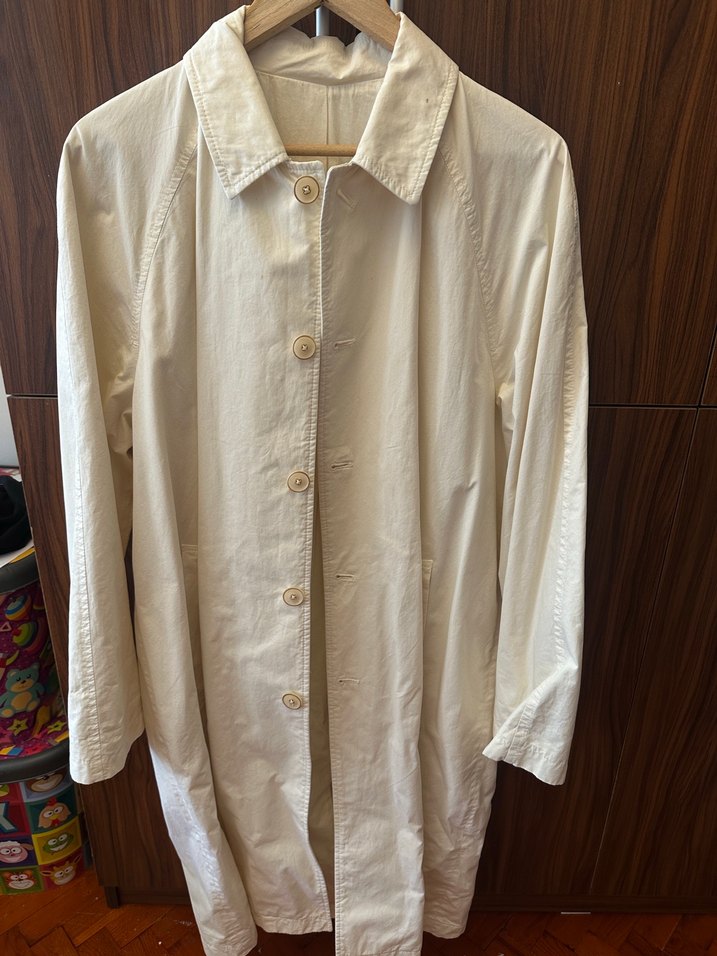 Beyaz midi uzunluğunda keten trençkot, düğmeli ve kesimli yakalıdır. Uzun kollu ve rahat kesimdir, günlük kullanıma uygundur. #zara #orjinal #man #erkek #yeni #sıfır iki yerinde iğne ucu kadar çıkarılır leke var. Ben uğraşmadım. #oversize iki koltuk arası 60 cm, boy 105 cm.